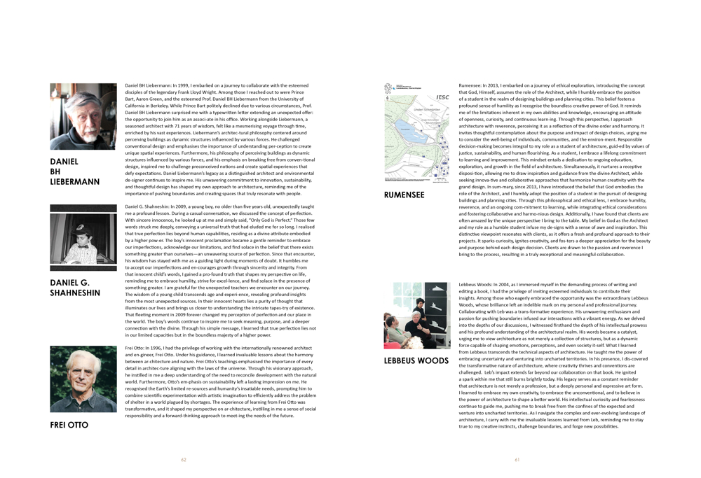 Rumensee: In 2013, I embarked on a journey of ethical exploration, introducing the concept that God, Himself, assumes the role of the Architect, while I humbly embrace the position of a student in the realm of designing buildings and planning cities. This belief fosters a profound sense of humility as I recognise the boundless creative power of God. It reminds me of the limitations inherent in my own abilities and knowledge, encouraging an attitude of openness, curiosity, and continuous learn-ing. Through this perspective, I approach architecture with reverence, perceiving it as a reflection of the divine order and harmony. It invites thoughtful contemplation about the purpose and impact of design choices, urging me to consider the well-being of individuals, communities, and the environ-ment. Responsible decision-making becomes integral to my role as a student of architecture, guid-ed by values of justice, sustainability, and human flourishing. As a student, I embrace a lifelong commitment to learning and improvement. This mindset entails a dedication to ongoing education, exploration, and growth in the field of architecture. Simultaneously, it nurtures a receptive disposi-tion, allowing me to draw inspiration and guidance from the divine Architect, while seeking innova-tive and collaborative approaches that harmonize human creativity with the grand design. In sum-mary, since 2013, I have introduced the belief that God embodies the role of the Architect, and I humbly adopt the position of a student in the pursuit of designing buildings and planning cities. Through this philosophical and ethical lens, I embrace humility, reverence, and an ongoing com-mitment to learning, while integrating ethical considerations and fostering collaborative and harmo-nious design. Additionally, I have found that clients are often amazed by the unique perspective I bring to the table. My belief in God as the Architect and my role as a humble student infuse my de-signs with a sense of awe and inspiration. This distinctive viewpoint resonates with clients, as it offers a fresh and profound approach to their projects. It sparks curiosity, ignites creativity, and fos-ters a deeper appreciation for the beauty and purpose behind each design decision. Clients are drawn to the passion and reverence I bring to the process, resulting in a truly exceptional and meaningful collaboration.