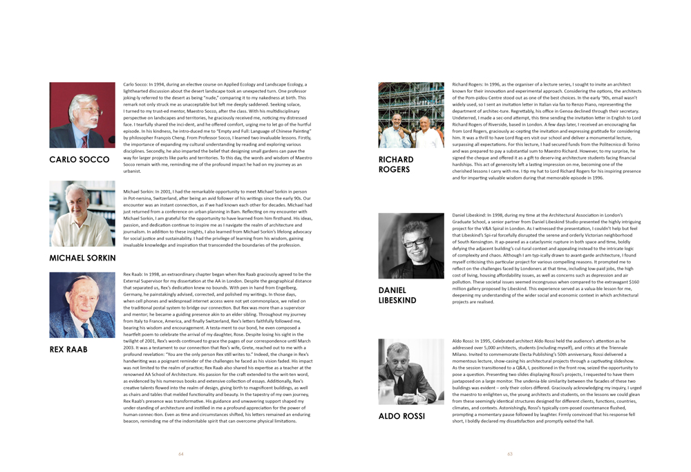 Rex Raab: In 1998, an extraordinary chapter began when Rex Raab graciously agreed to be the External Supervisor for my dissertation at the AA in London. Despite the geographical distance that separated us, Rex’s dedication knew no bounds. With pen in hand from Engelberg, Germany, he painstakingly advised, corrected, and polished my writings. In those days, when cell phones and widespread internet access were not yet commonplace, we relied on the traditional postal system to bridge our connection. But Rex was more than a supervisor and mentor; he became a guiding presence akin to an elder sibling. Throughout my journey from Italy to France, America, and finally Switzerland, Rex’s letters faithfully followed me, bearing his wisdom and encouragement. A testa-ment to our bond, he even composed a heartfelt poem to celebrate the arrival of my daughter, Rose. Despite losing his sight in the twilight of 2001, Rex’s words continued to grace the pages of our correspondence until March 2003. It was a testament to our connection that Rex’s wife, Grete, reached out to me with a profound revelation: “You are the only person Rex still writes to.” Indeed, the change in Rex’s handwriting was a poignant reminder of the challenges he faced as his vision faded. His impact was not limited to the realm of practice; Rex Raab also shared his expertise as a teacher at the renowned AA School of Architecture. His passion for the craft extended to the writ-ten word, as evidenced by his numerous books and extensive collection of essays. Additionally, Rex’s creative talents flowed into the realm of design, giving birth to magnificent buildings, as well as chairs and tables that melded functionality and beauty. In the tapestry of my own journey, Rex Raab’s presence was transformative. His guidance and unwavering support shaped my under-standing of architecture and instilled in me a profound appreciation for the power of human connec-tion. Even as time and circumstances shifted, his letters remained an enduring beacon, reminding me of the indomitable spirit that can overcome physical limitations.