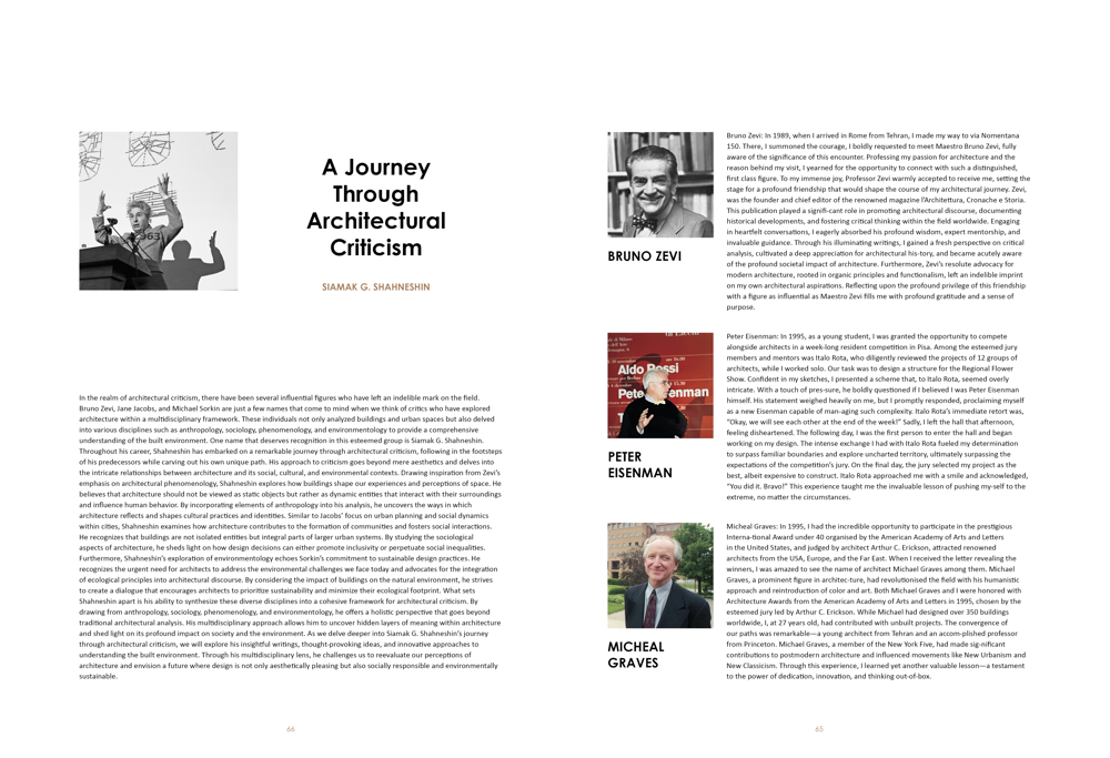 Micheal Graves: In 1995, I had the incredible opportunity to participate in the prestigious Interna-tional Award under 40 organised by the American Academy of Arts and Letters in the United States, and judged by architect Arthur C. Erickson, attracted renowned architects from the USA, Europe, and the Far East. When I received the letter revealing the winners, I was amazed to see the name of architect Michael Graves among them. Michael Graves, a prominent figure in architec-ture, had revolutionised the field with his humanistic approach and reintroduction of color and art. Both Michael Graves and I were honored with Architecture Awards from the American Academy of Arts and Letters in 1995, chosen by the esteemed jury led by Arthur C. Erickson. While Michael had designed over 350 buildings worldwide, I, at 27 years old, had contributed with unbuilt projects. The convergence of our paths was remarkable—a young architect from Tehran and an accom-plished professor from Princeton. Michael Graves, a member of the New York Five, had made sig-nificant contributions to postmodern architecture and influenced movements like New Urbanism and New Classicism. Through this experience, I learned yet another valuable lesson—a testament to the power of dedication, innovation, and thinking out-of-box.