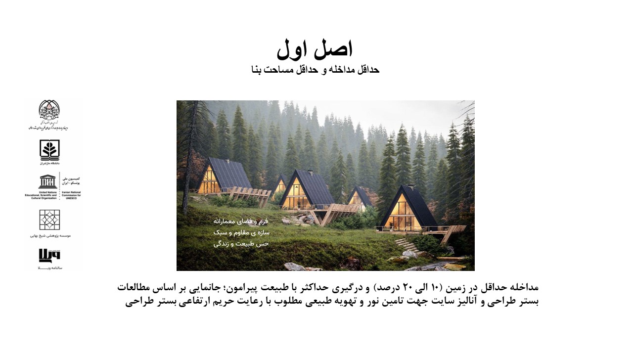 الف- مداخله حداقل در زمین (10 الی 20 درصد) و درگیری حداکثر با طبیعت پیرامون؛ جانمایی بر اساس مطالعات بستر طراحی و آنالیز سایت جهت تامین نور و تهویه طبیعی مطلوب با رعایت حریم ارتفاعی بستر طراحی