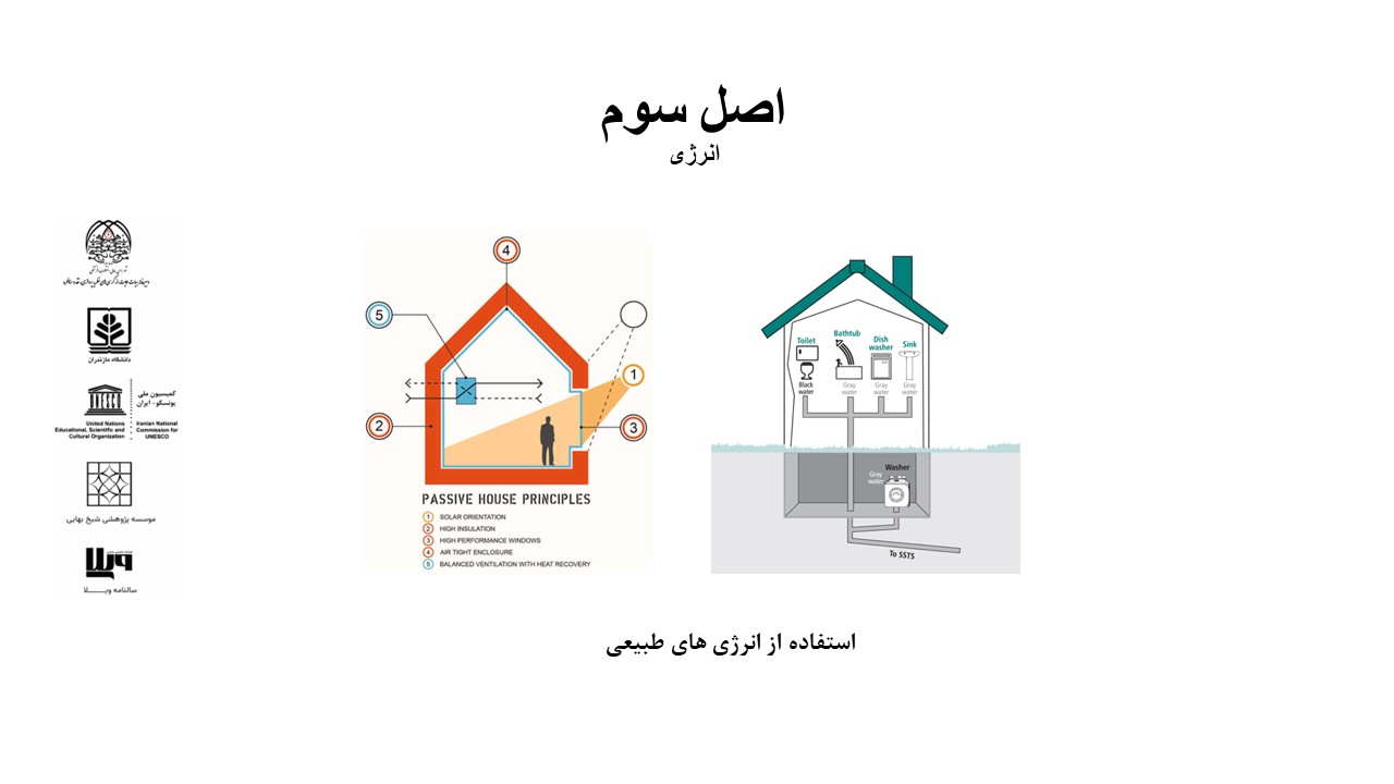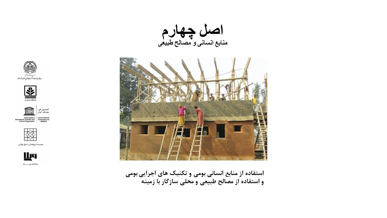 د- استفاده از منابع انسانی بومی و تکنیک های اجرایی بومی و استفاده از مصالح طبیعی و محلی سازگار با زمینه